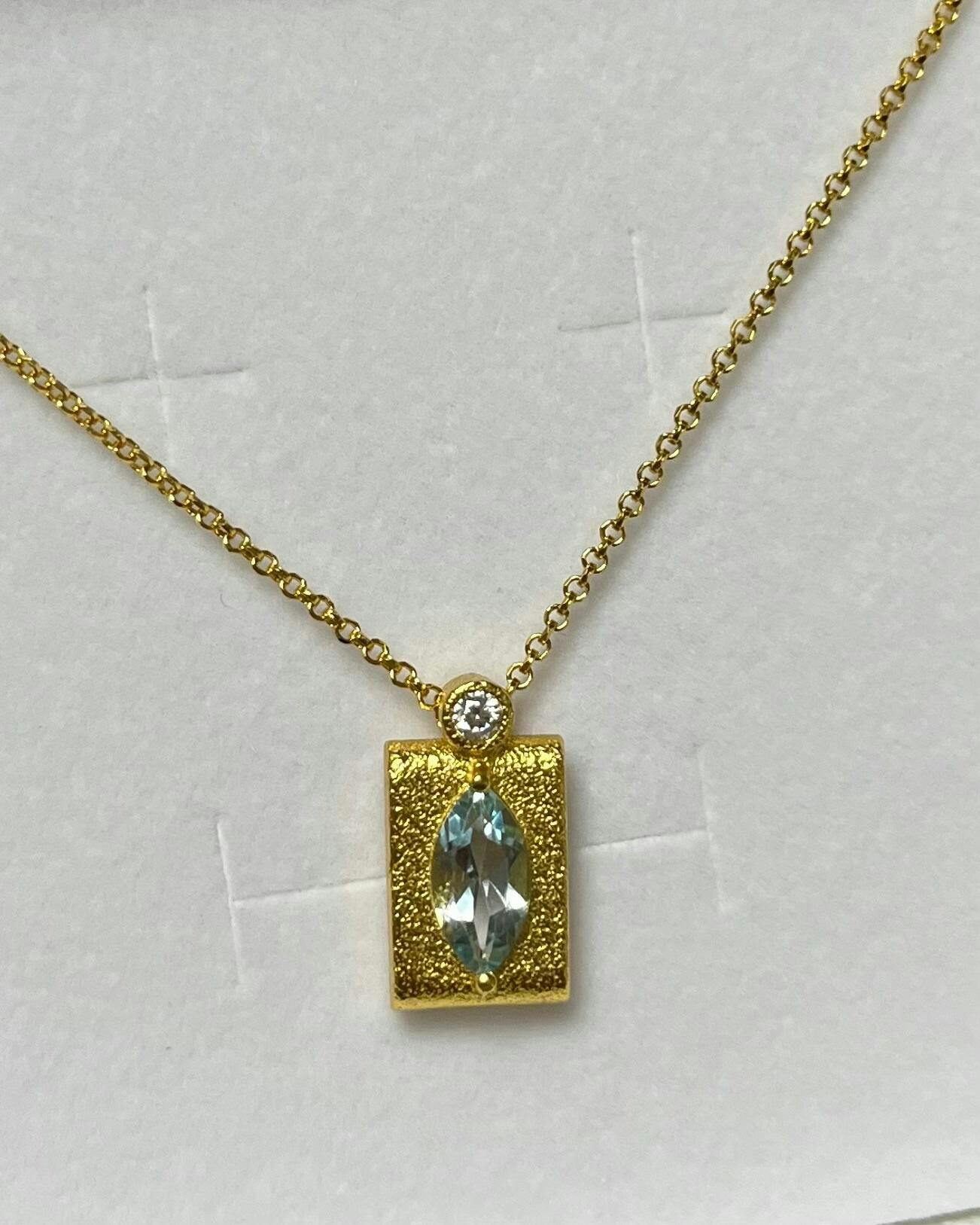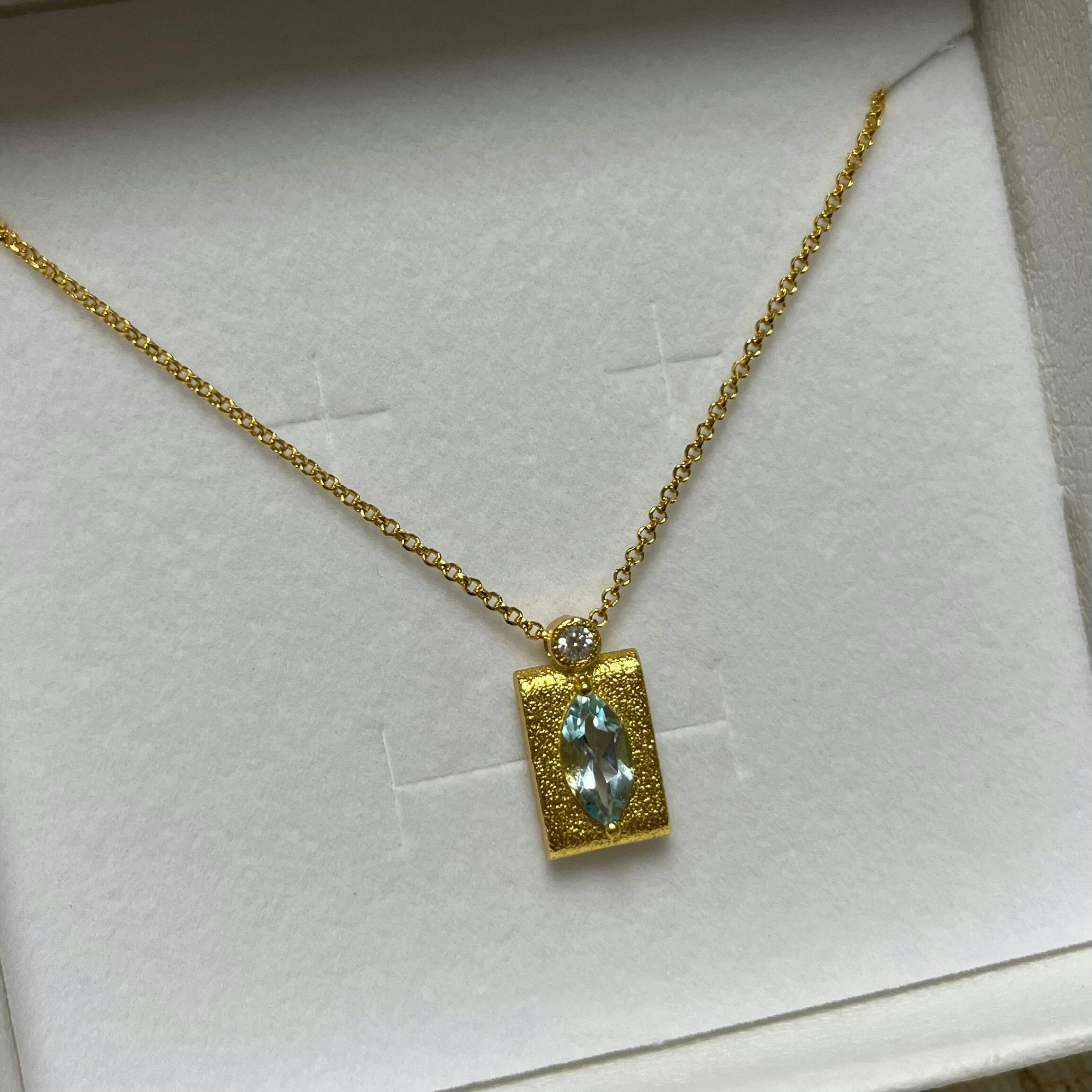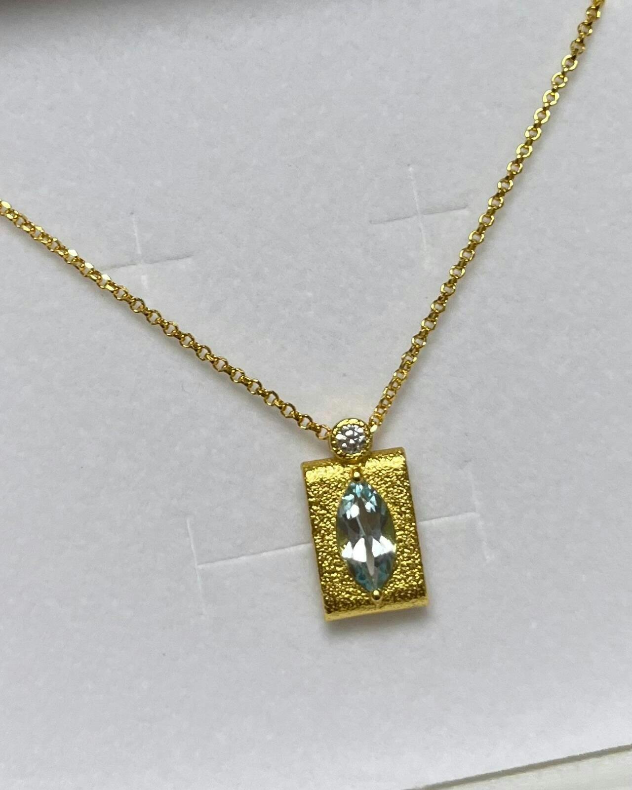 Ein himmelblauer Edelstein, eingefasst in antikem Gold — Cadre d’Azur entfaltet ihren Charme durch traditionelle Handwerkskunst: Der handveredelte, rechteckige Anhänger ist inspiriert von antiker Kunst und zeichnet sich durch eine mattierte Struktur aus, die im Kontrast mit dem Glanz des natürlichen Blautopas steht. Ein leises Statement – erlesen, strahlend und zeitlos.