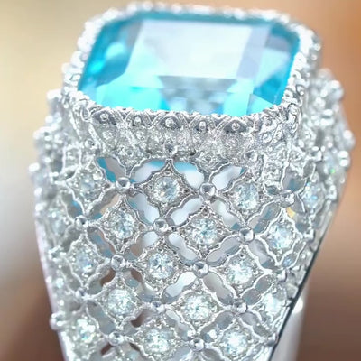 El radiante topacio azul brilla como un lago helado al amanecer, engastado en una corona de esculpida brillantez.