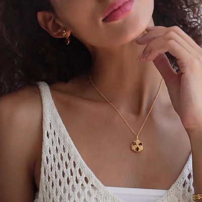 A crown in miniature, worn at your collarbone. This vintage-inspired pendant blends royal charm with modern craftsmanship, featuring four rich garnets set in a floral medallion of 18ct recycled gold vermeil. Designed to echo the grace of heirloom treasures, it adds a noble touch to any moment—whether ordinary or unforgettable.