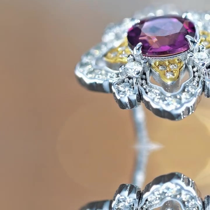 A rose born of Florence’s golden age. These earrings echo the lavish spirit of Renaissance art and architecture. Sculpted in solid sterling silver and crowned with 18ct white and yellow gold vermeil, each floral frame holds a vivid Pyrope–Almandine Garnet. Its deep plum hue, encircled by a gleaming zirconia halo, recalls the stained glass and filigree of Italian cathedrals.