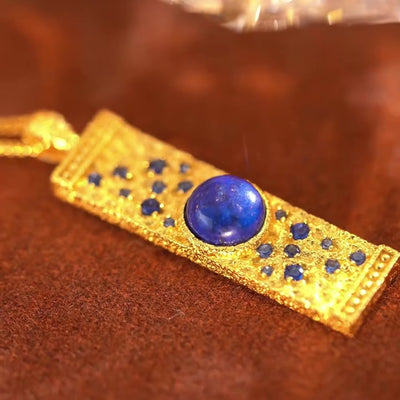 Inspired by Renaissance artistry and sacred symbolism, the Lapis Icona Necklace evokes the aura of an ancient cathedral icon. Its gold surface is meticulously hand-brushed to create a rich texture reminiscent of aged altarpieces, while the deep blue of natural lapis lazuli anchors the piece like a celestial focal point. Each sparkling detail is set by hand, forming a composition that feels both mystical and regal.