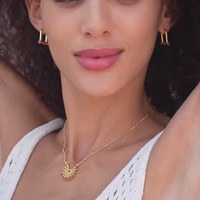 Radiating with strength and precision, the Solstice Medallion Necklace is a bold tribute to celestial symmetry. Its striking fan-shaped design—meticulously arranged with gemstone rays around a radiant core—commands attention from every angle. A powerful piece for those who embrace beauty with intention.
